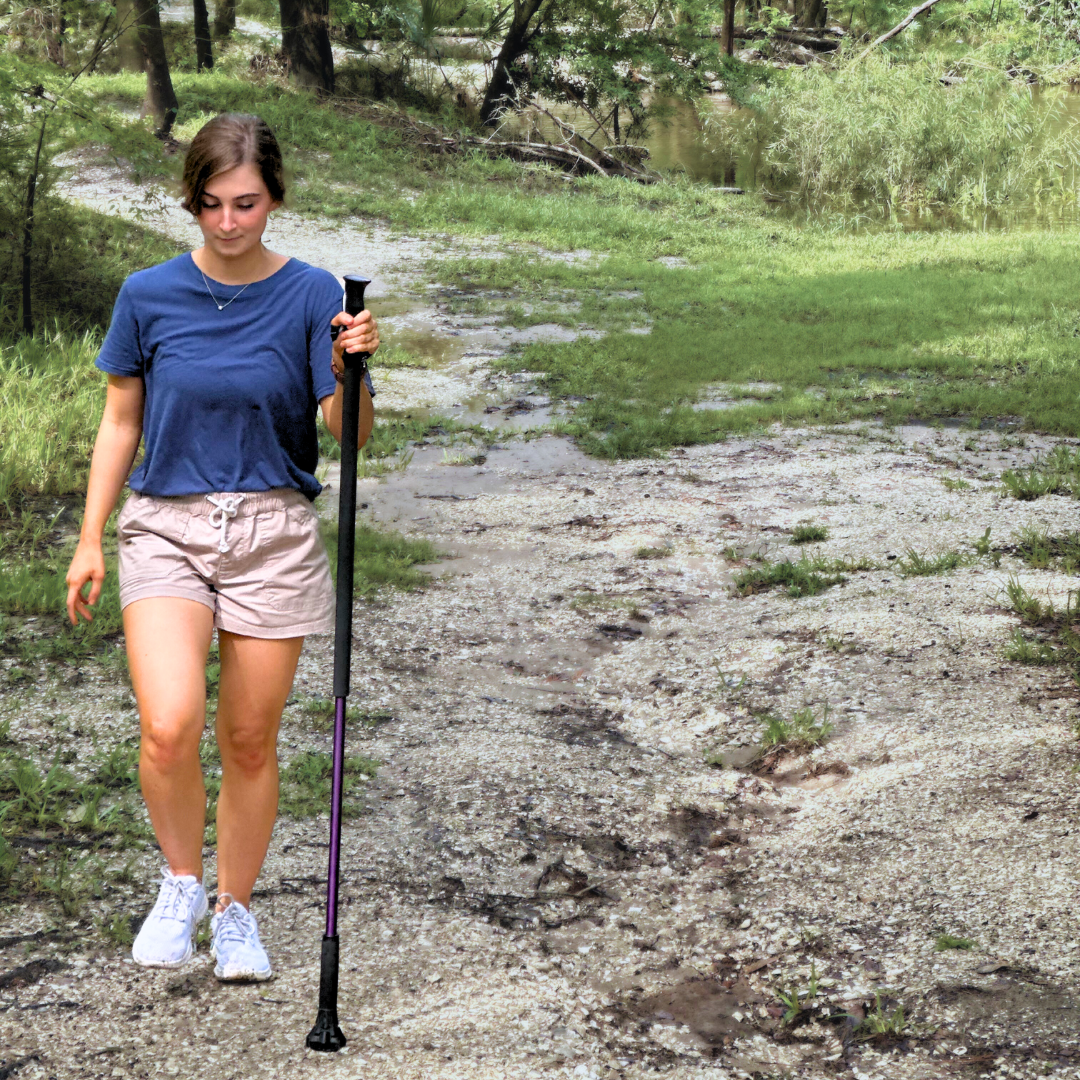It provides light support on smooth indoor surfaces like tile, hardwood, and carpet, while also offering stability on outdoor surfaces like sidewalks, grass, trails, and light gravel. It also provides stability on uneven or slippery surfaces, like hospital floors, wet shower tiles or even the beach!